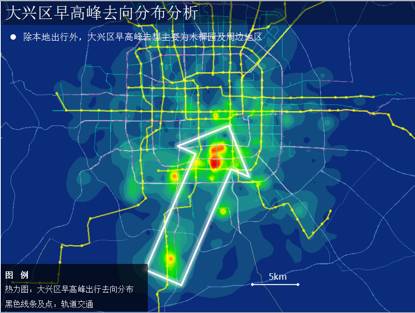我们对北京早高峰时期的轨迹数据进行了可视化。最终整理了昌平、大兴、通州、亦庄四地去向分布可视化地图。