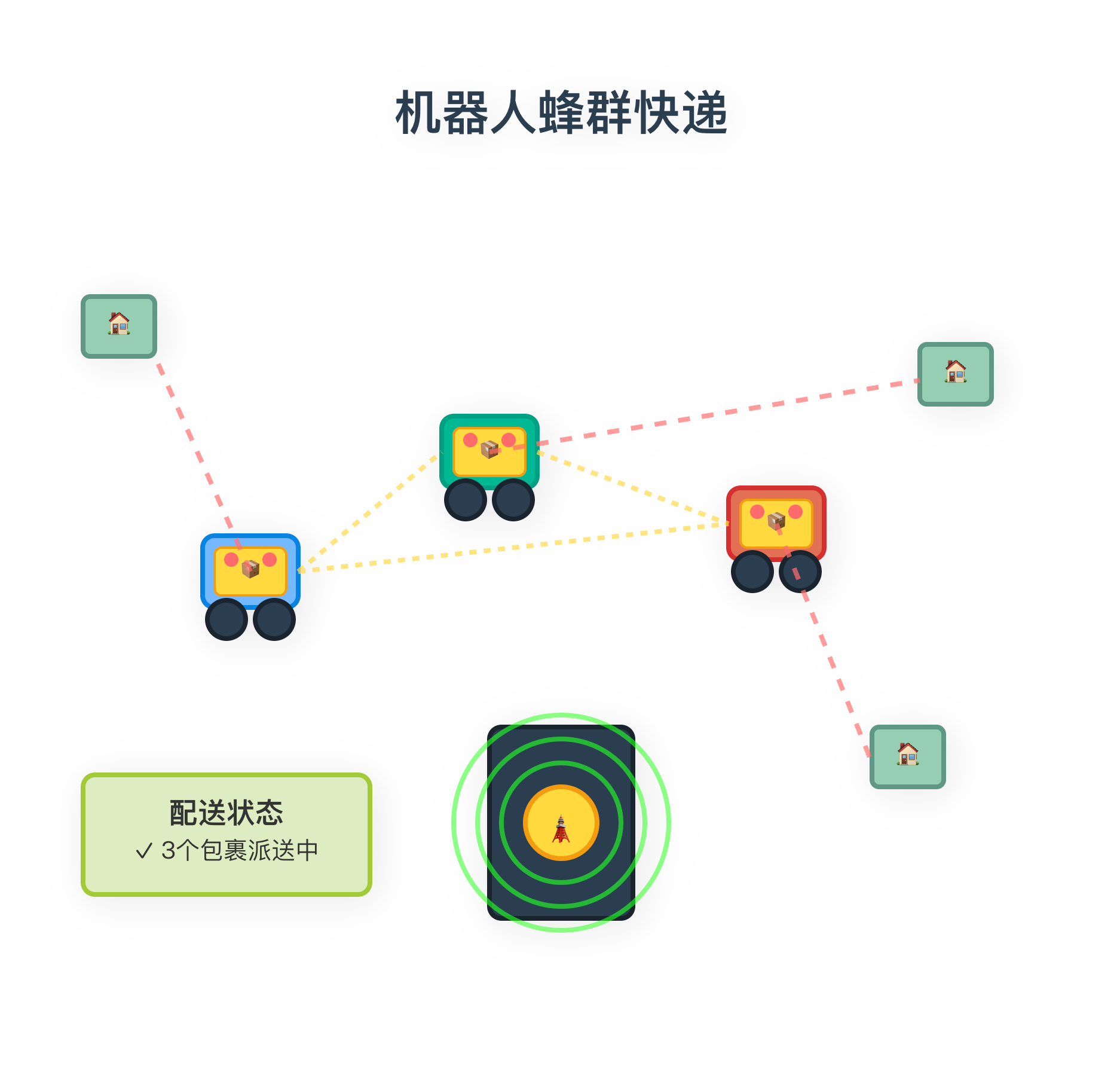 - • 地下物流:AGV 像蜜蜂一样排布路线,错峰+秒级调度,拥堵概率下降 40%。物流机器人可以自主选择最优路径,甚至在拥堵区域形成临时"绕行联盟",实现分布式智能调度。