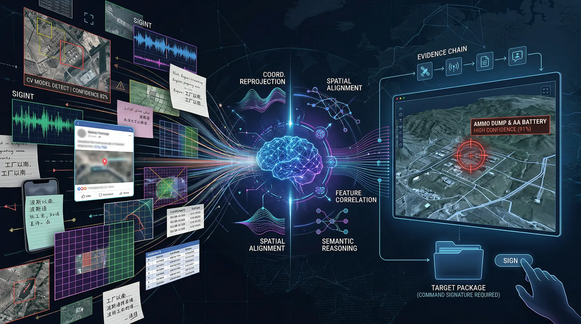 一张图框了个目标,置信度82%。另一份SIGINT报告说某频段在三小时前出现过短暂活动。一份人力情报线报提到"工厂以南两公里有异常车辆集结"。一条社交媒体帖子带了个模糊地理标签。历史目标库里有一条相似记录,但坐标用的是不同格式,地名是波斯语的另一种转写方式。