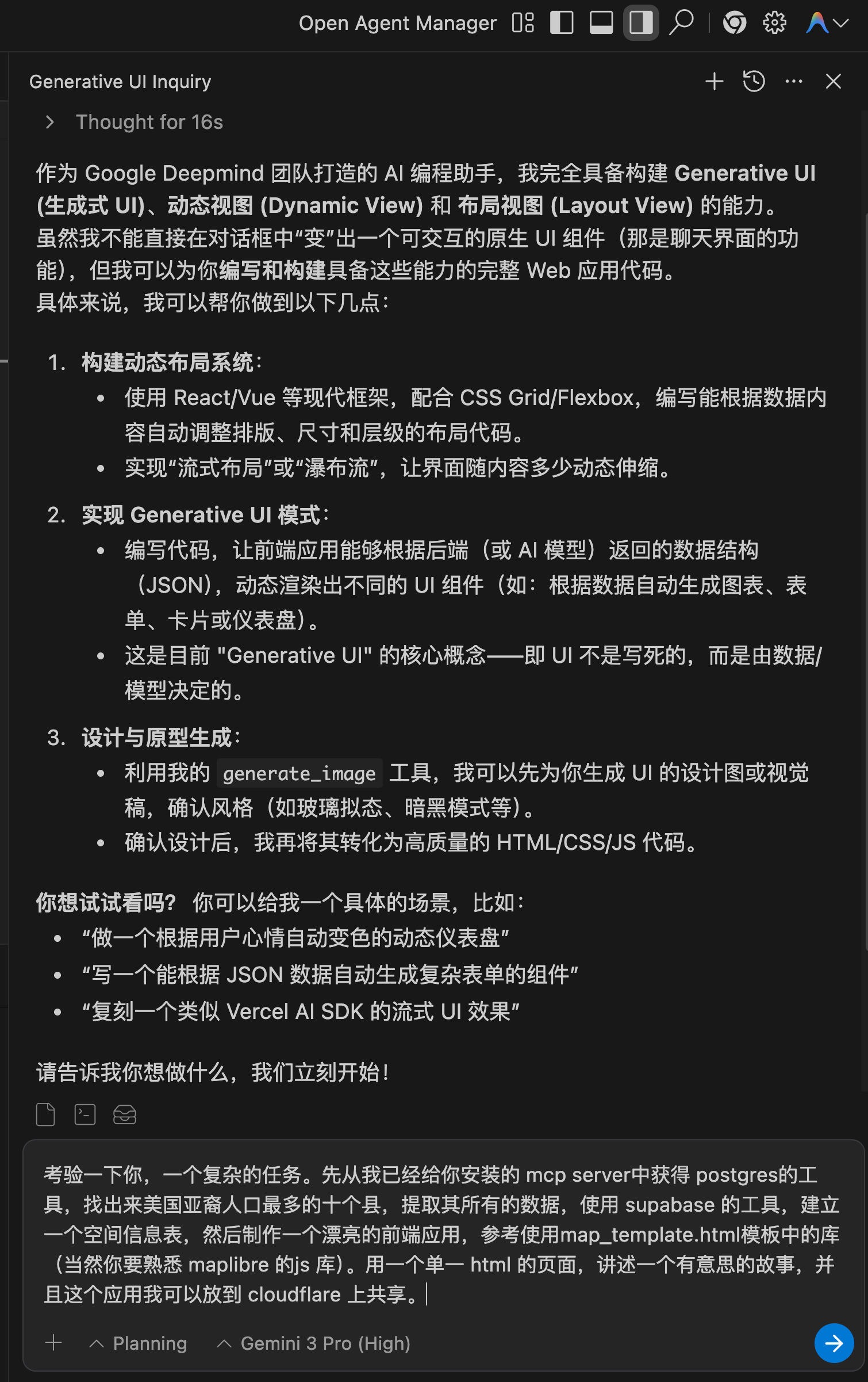 简单来说,Gemini 不再只是帮你写一段 Python 脚本去跑缓冲区分析(Buffer),它是根据你的需求,现场设计 UI、现场挂载数据、现场构建一个只为你此刻决策服务的“GIS 系统”。当然,私有数据你要自己准备好。