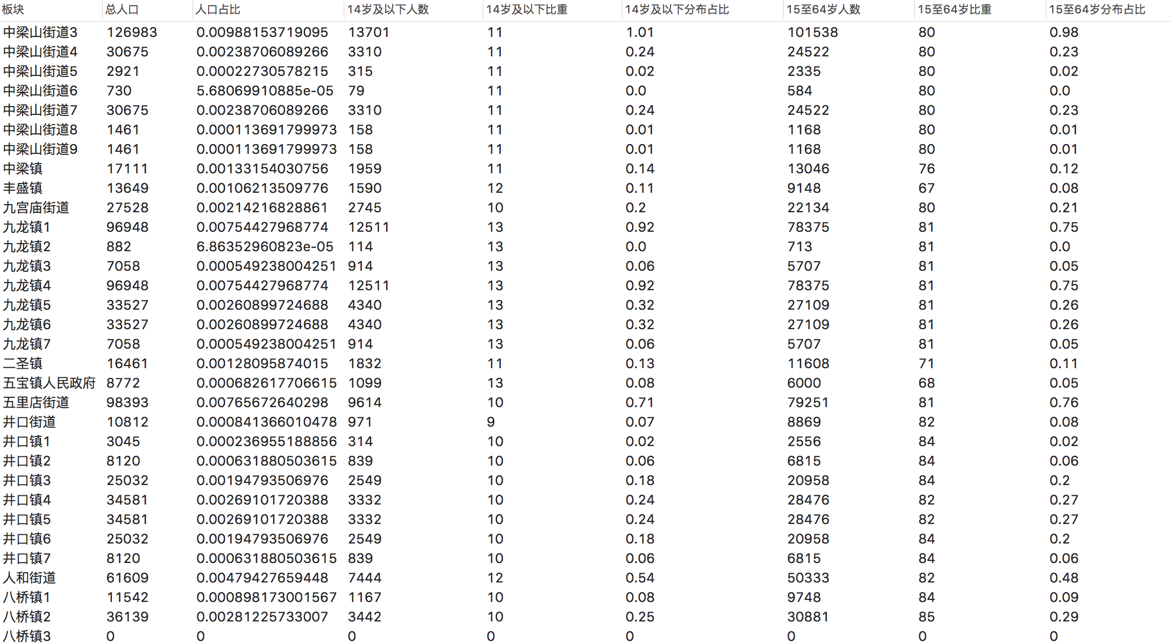 各年龄段(14岁以下、15-64、65岁以上)人口数据
