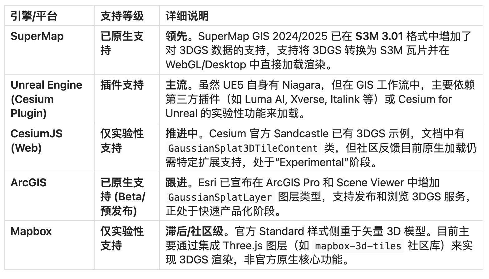 2. **成熟度量化统计**:其次,请搜索并统计目前 GIS 头部引擎(如 Cesium, Mapbox, ArcGIS, Unreal Engine GIS插件,Supermap)对 Gaussian Splats 的支持情况。请用“已原生支持”、“插件支持”、“仅实验性支持”三个等级进行分类。