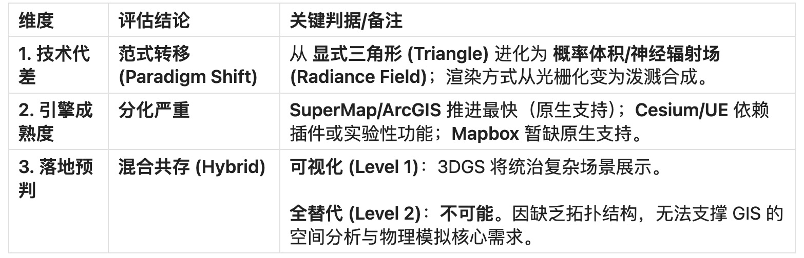* **级别 2 判据**:这些技术是否具备在未来 5 年内,取代传统三角网格(Mesh)成为城市级实景三维(Reality Capture)主流交付格式的可能性?