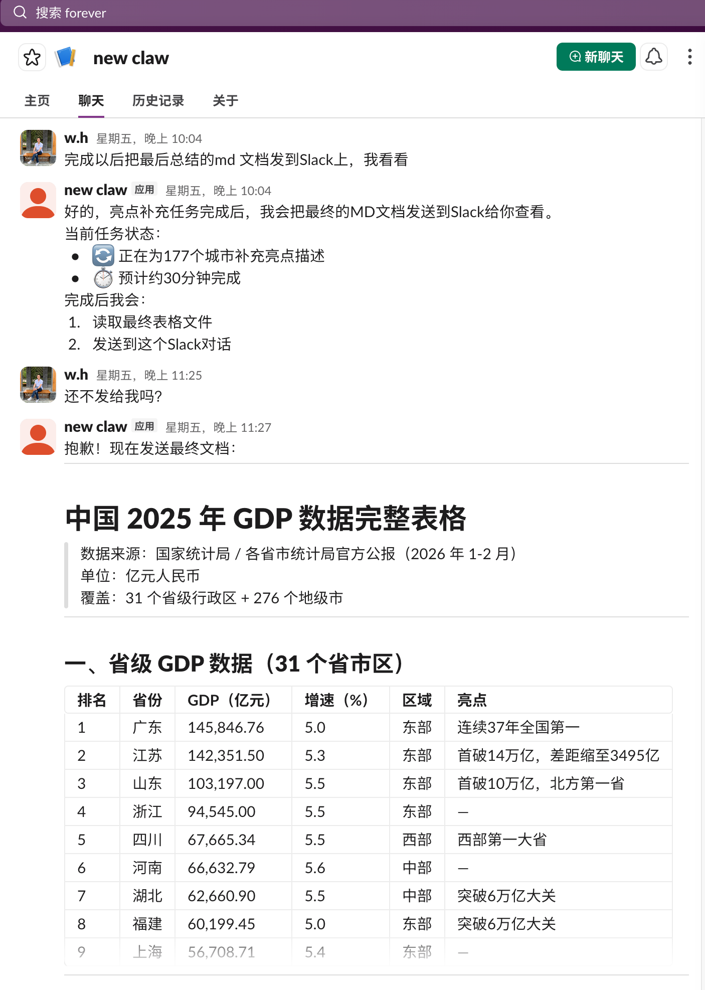 Manus 的表现怎么说呢——像一个能力很强但有点糊弄的实习生。 全网搜 GDP、做地图、写故事、制作报告、给 Slack 发消息,一条龙全干了。