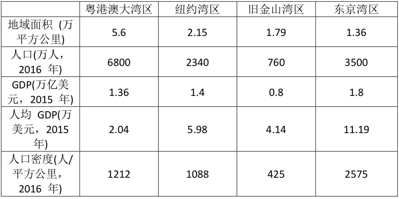 东京湾聚集了日本1/3人口、2/3经济总量、3/4工业产值,一大批世界五百强企业总部均设于此地,又称之为“产业湾区”。 纽约湾区是世界金融的核心中枢 ,美国7家大银行中的6家,2900多家世界金融、证券、期货及保险和外贸机构均设于此,成为世界金融的心脏,称之为“金融湾区”。 旧金山湾区拥有举世知名的硅谷和斯坦福、加州伯克利等20多所著名大学,谷歌、苹果、Facebook等互联网巨头,称之为“科技湾区”。而粤港澳大湾区与这三大湾区的比较,如下表所示: