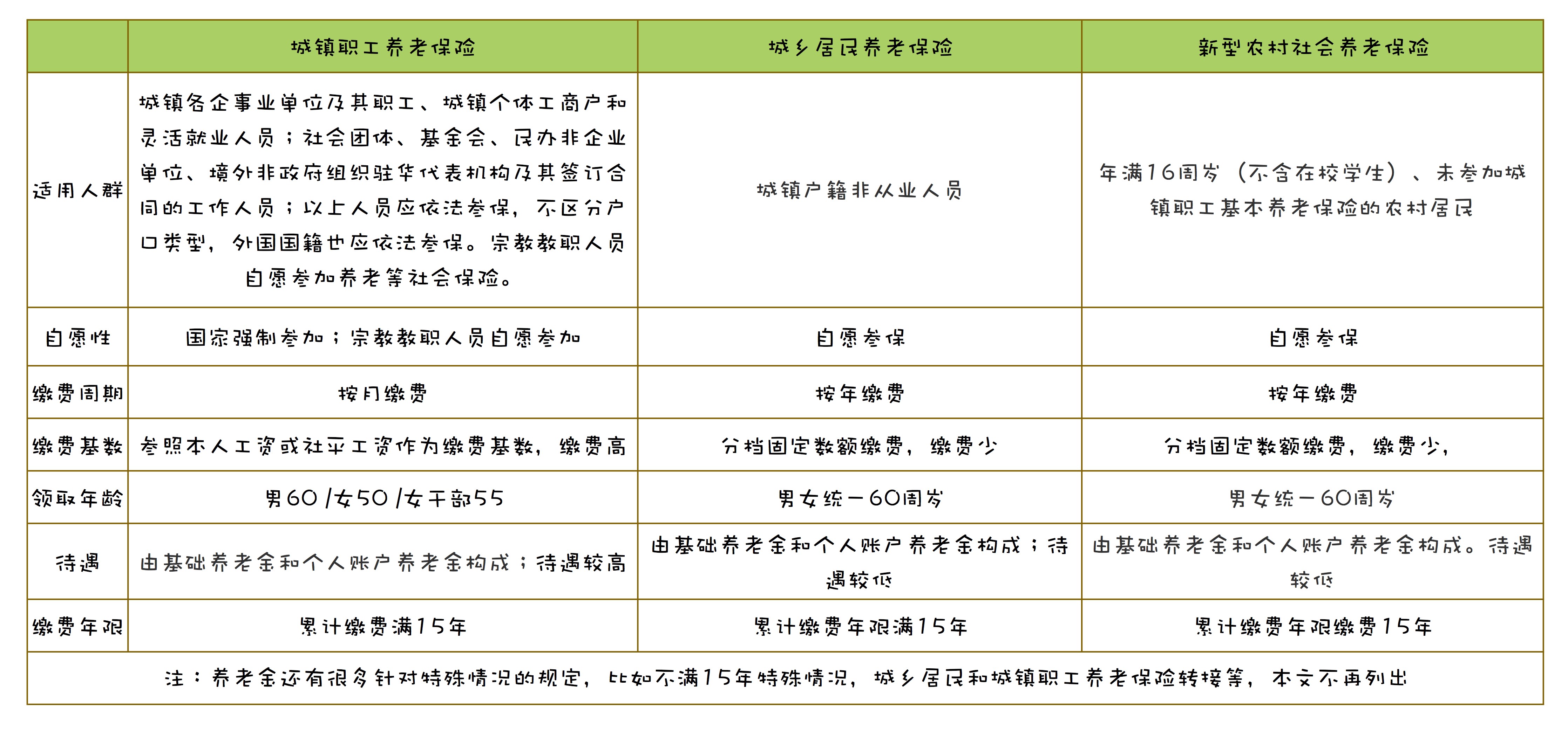 中国的社会养老保险不断改革,截止目前,我国社会养老保险体系由城镇居民社会养老保险、城镇职工养老保险体系、新型农村社会养老保险制度共同构成。注:三种保险的区别见文章末尾的表格